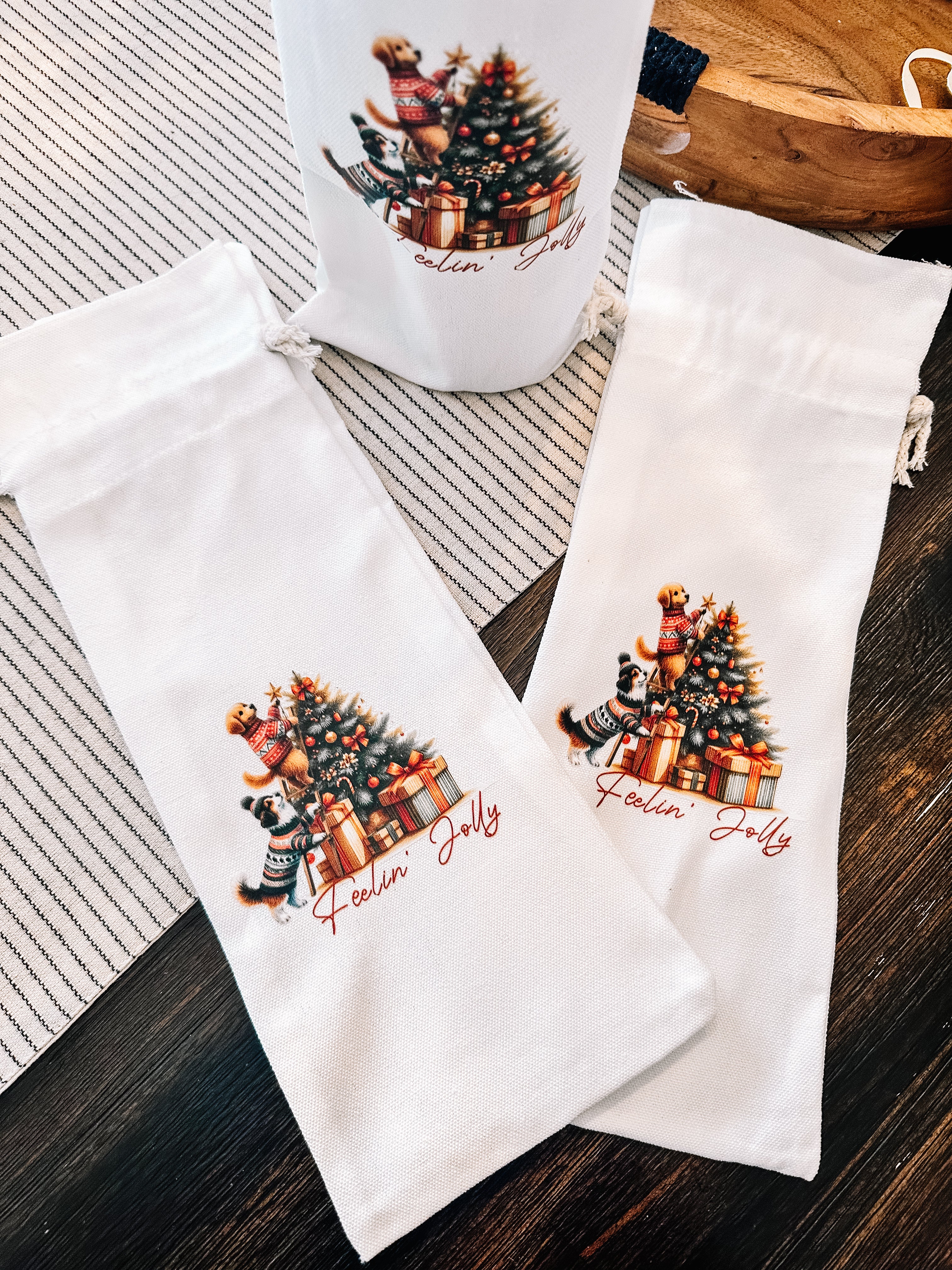 White canvas wine bag with draw string. Fits a standard wine bottle. Perfect gifting option for the dog lover in your life!