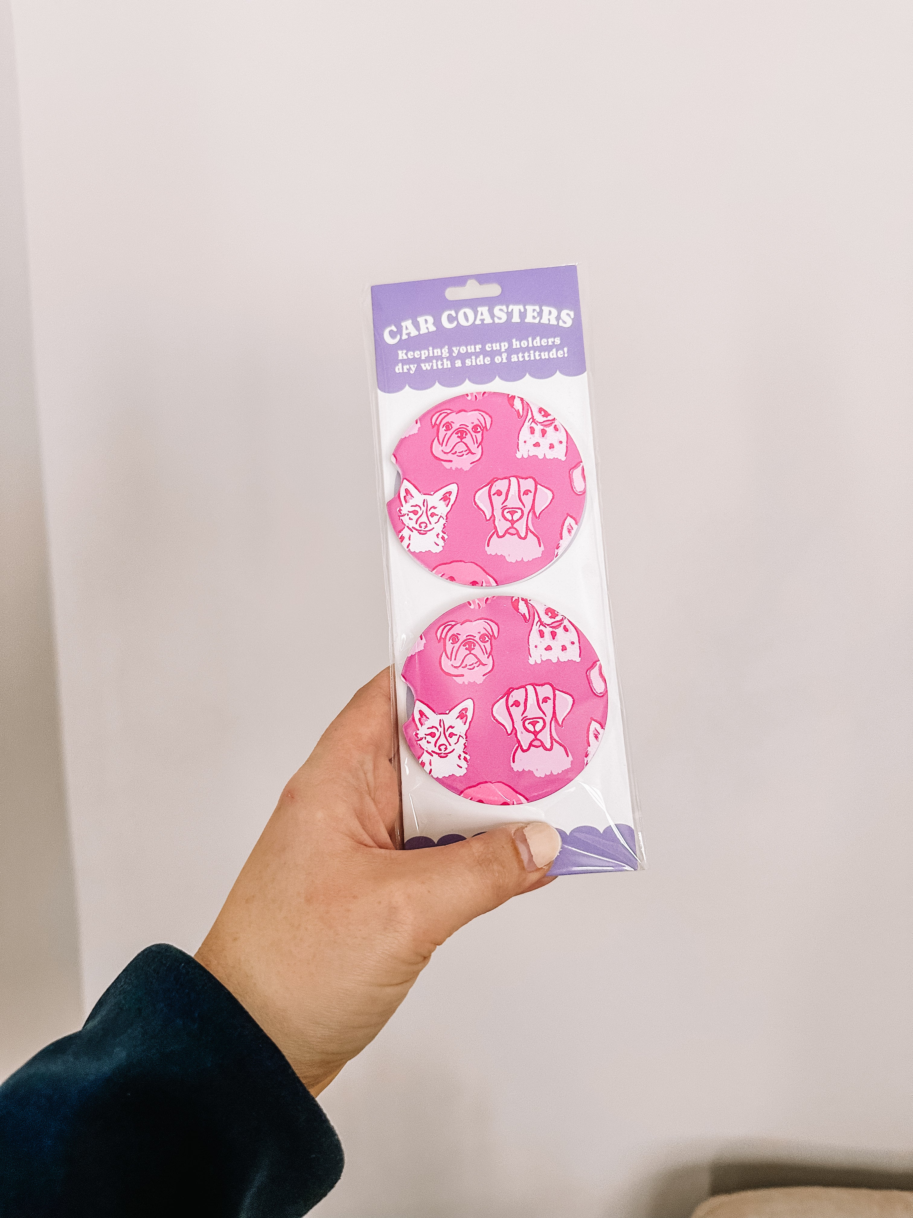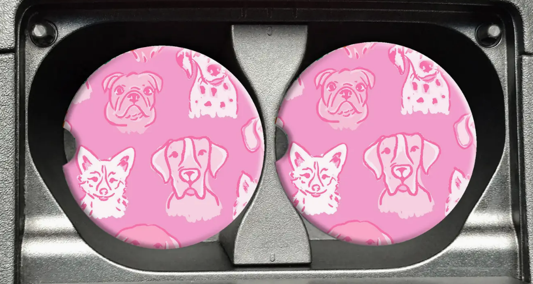 Paws and pink perfection! These adorable dog coasters are a must-have for the fashion-forward dog mom on the go. Crafted from durable sandstone, this set of two coasters features a round divot on each side for effortless removal from your car cup holders. Travel in style with coasters as fabulous as your BFF.